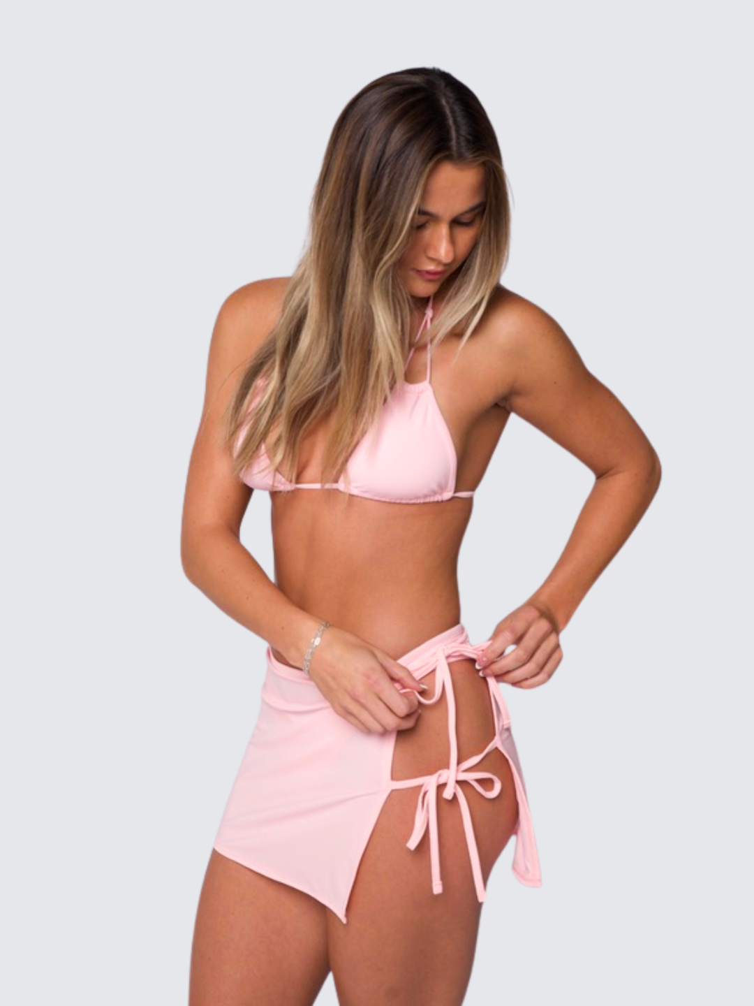 A MUST HAVE Accessory, our Beach Skirt! She is the ultimate mini wrap skirt, adorned with two playful ties on the left side, this skirt is a head turner. Crafted from the same fabric as our bikinis, our beach skirt can be worn in and out of the water!